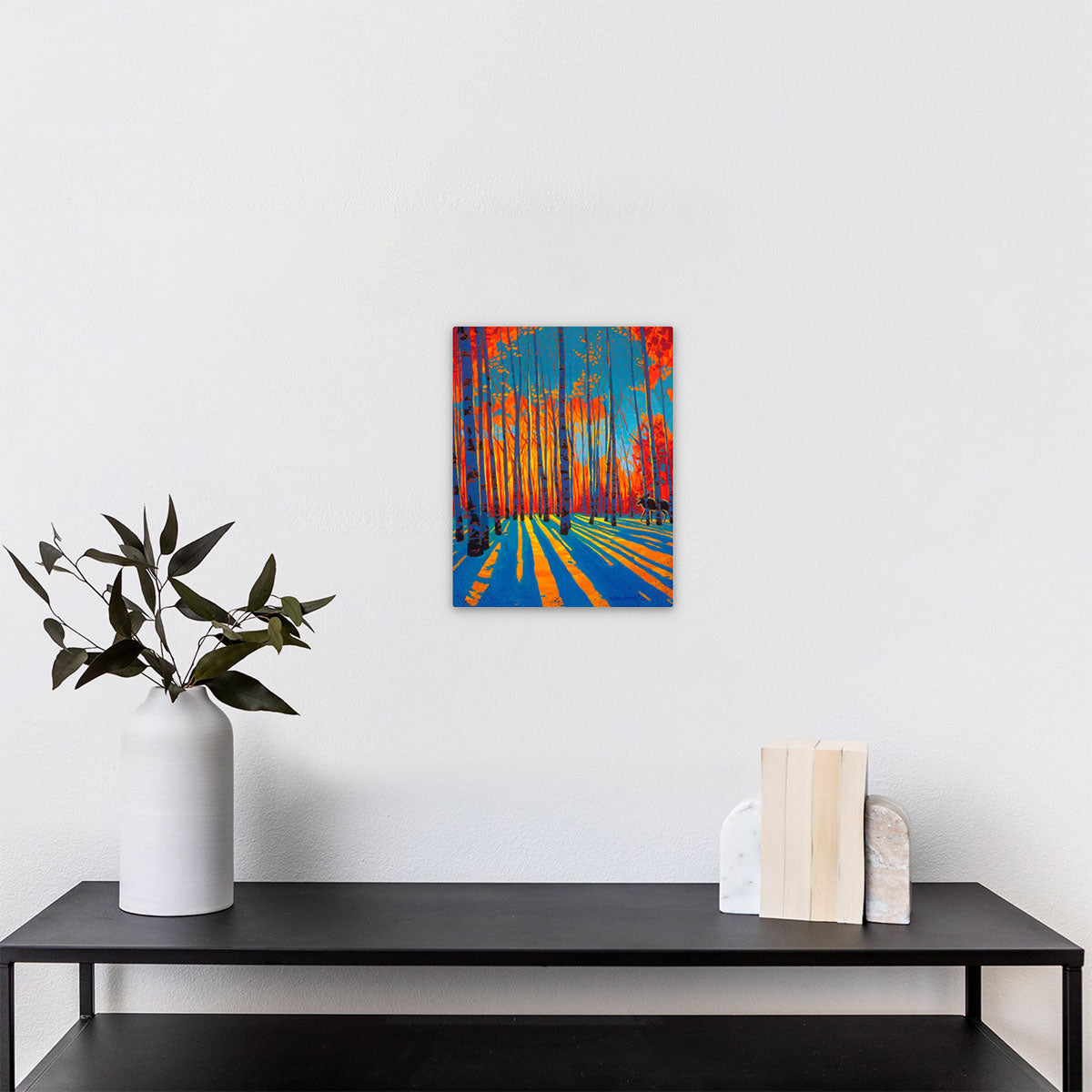 I took the idea of skeletal as beauty. The result was a "skeletal" looking forest where the trees are beginning to lose their leaves for the winter with a vibrant blue sky and fall colors. Hey, there's a moose!