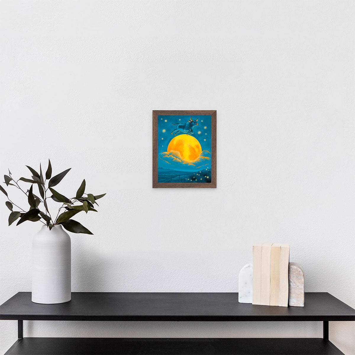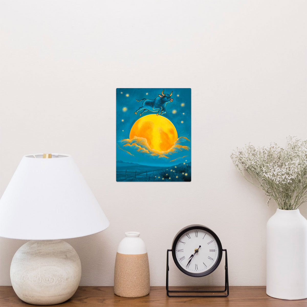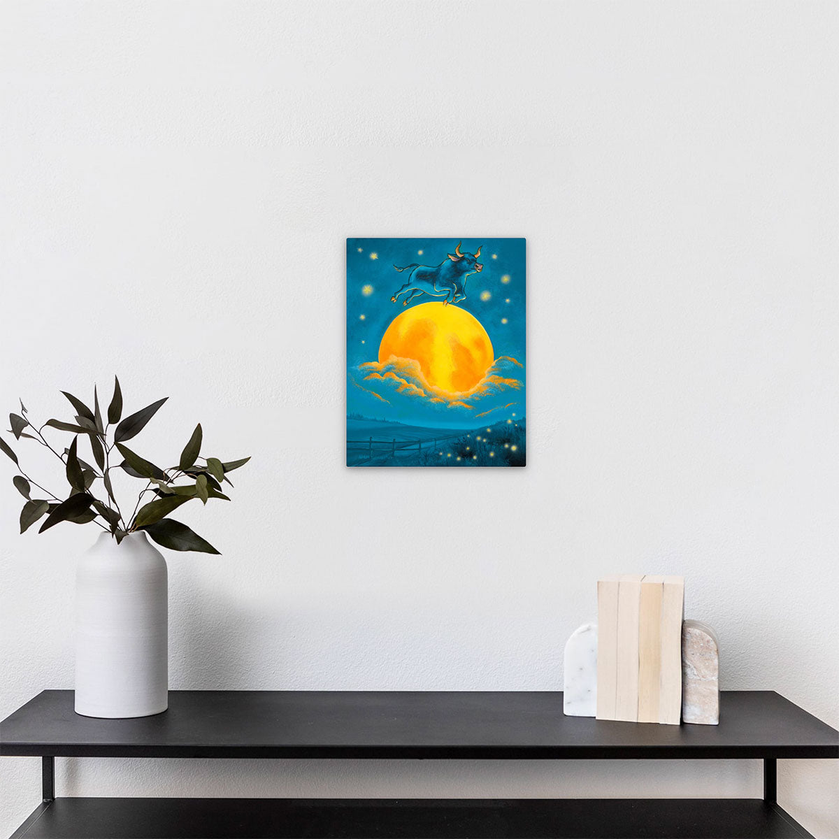 I made a painting in the Spring of 2025, Twinkle, that included numerous characters from childhood nursery rhymes. One of those was the cow jumping over the moon, however, I made the cow into the infamous Babe the Blue Ox. I always loved that particular part of the of the painting. I decided to make the main emphasis of Over the Moon only about Minnesota's beloved Babe the Blue Ox, and maybe some fluttery fireflies too.