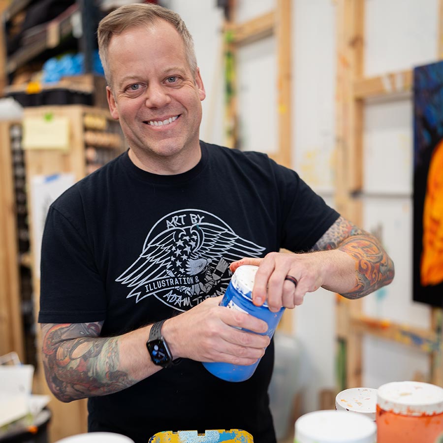 Adam grew up in the Twin Cities and got his start as an artist by making gig posters for bands coming through popular Twin Cities venues. He drew influence from the bold, graphic style of 80s art and comics. Adam started his professional studio practice in 2003, and since then has become one of Minnesota’s most popular artists.