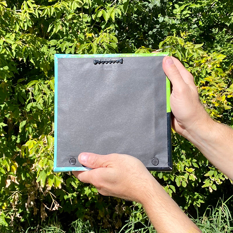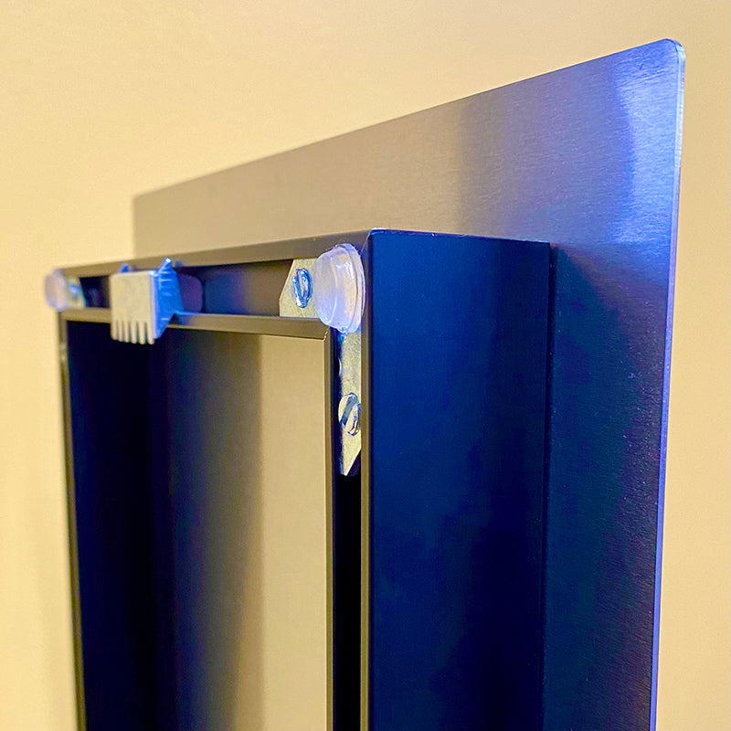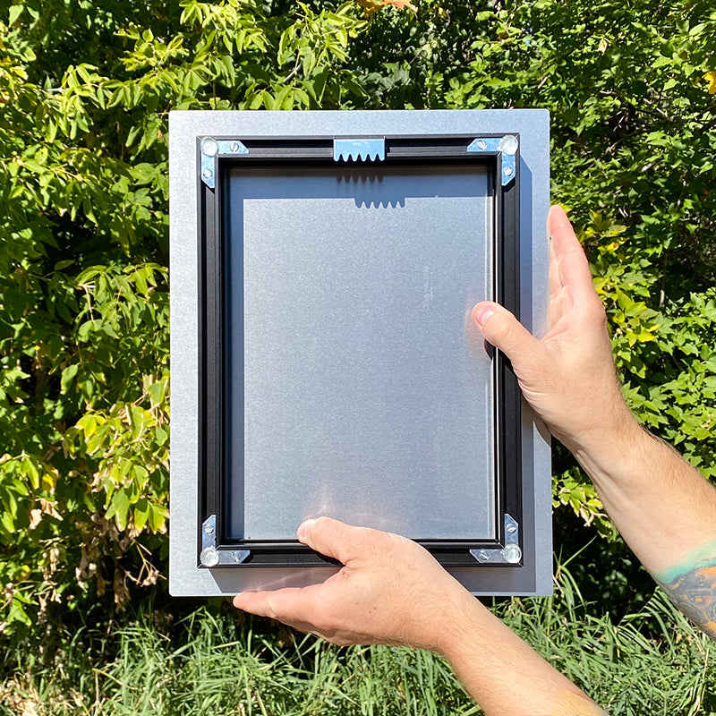 Metal prints include a black metal frame that is inset from the print’s edge with a 1-5/16" depth and finished with a sawtooth or wire hanger.