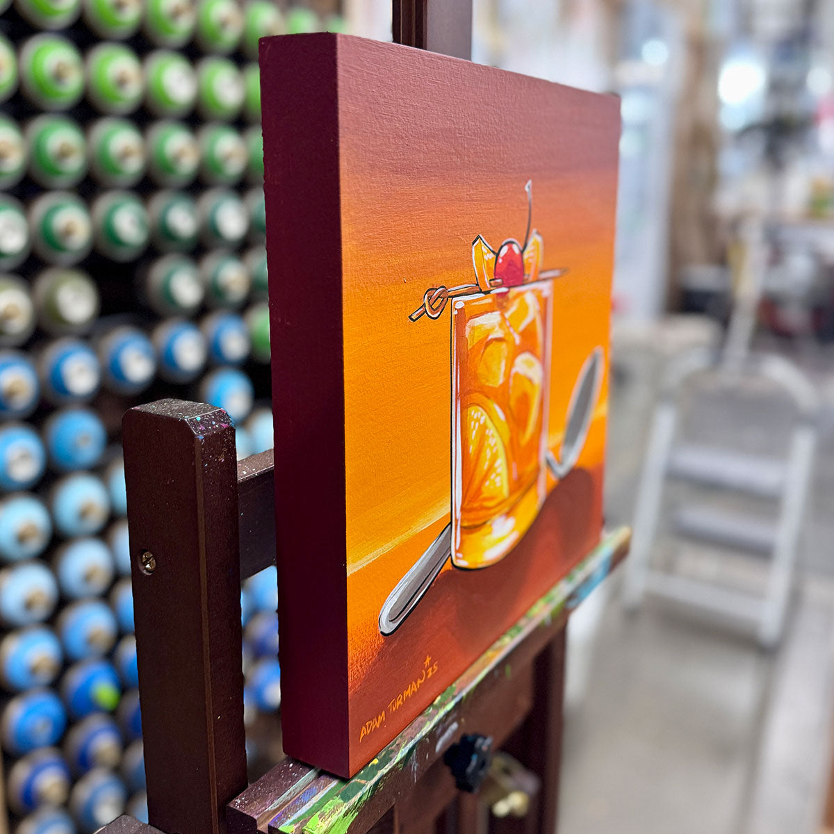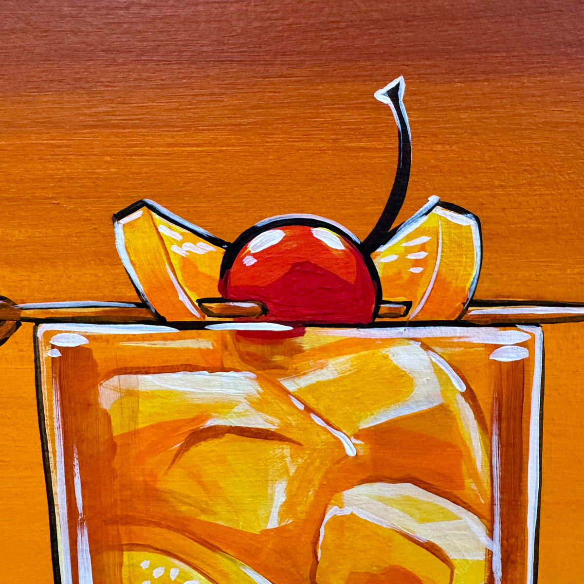 Some of these concepts from the prompt to the final image are a stretch. Just go with it. Some fancy Old Fashioned drinks come with a cherry pieced by a cocktail pick, so I went with that idea. Drink up, buttercup.