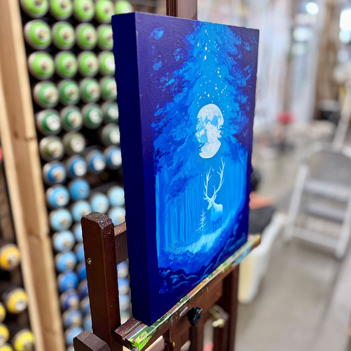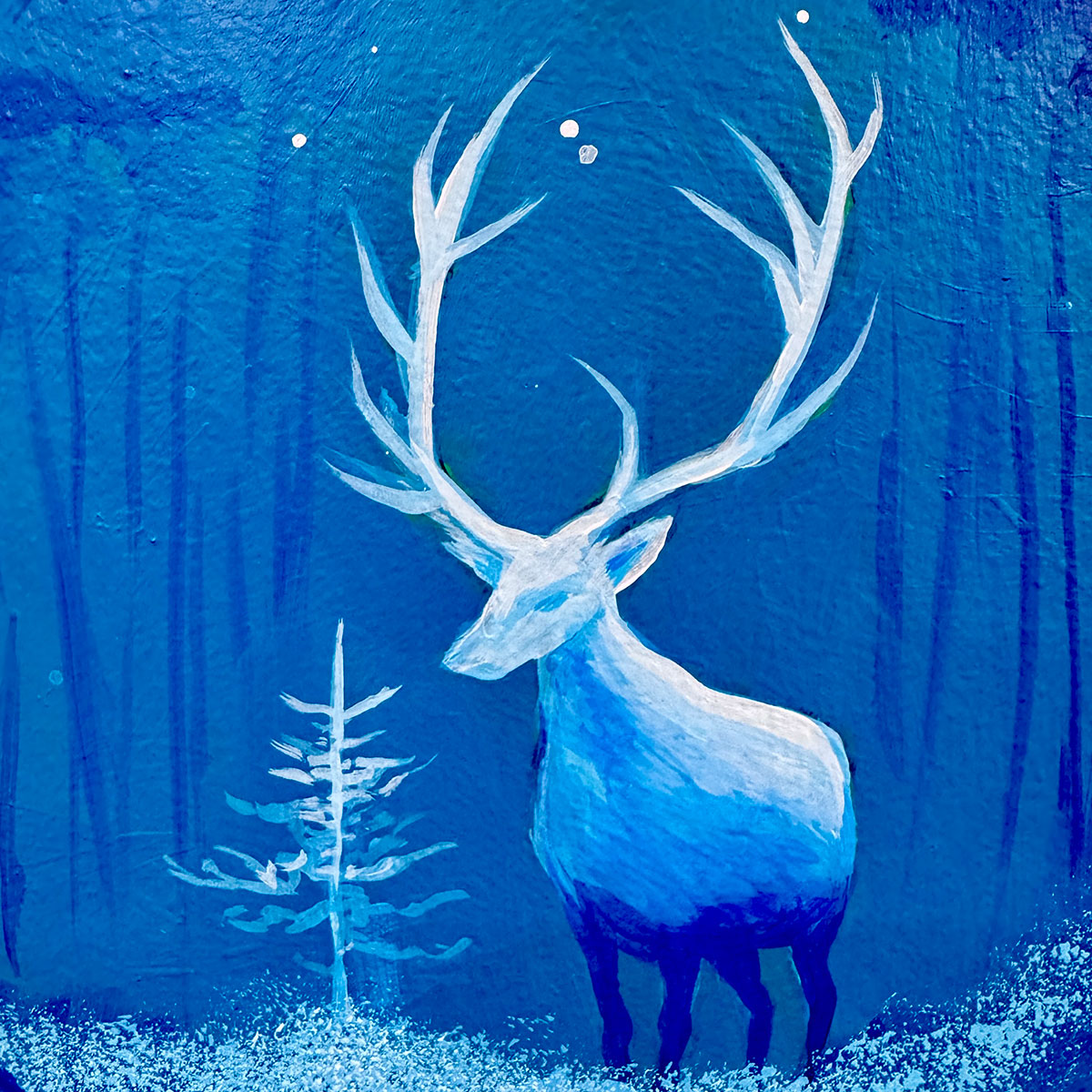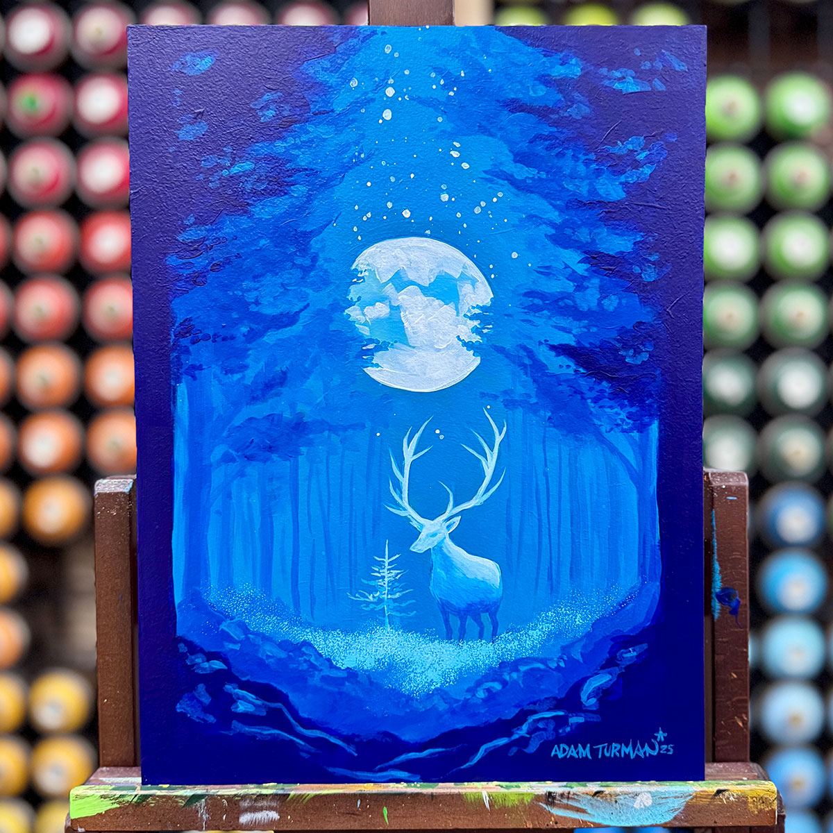I took a couple of ideas from this very definitive prompt: Deer. I saw the Disney movie Bambi when I was a kid and always loved the amazing artwork of the forest and the scenes with the young fawn's father. I read the Harry Potter books when I was in my late 20's (no judging) and loved the Stag Patronus parts. They reminded me of the 1942 Bambi film. This painting is a mish-mash of those images with nostalgia.
