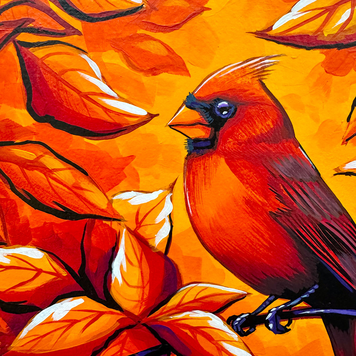 Bright red, orange, and yellow fall leaves look as though the trees they fall from are on fire. I love fall. The air is crisp and the colors are absolutely amazing, especially when paired with a bright red Cardinal.